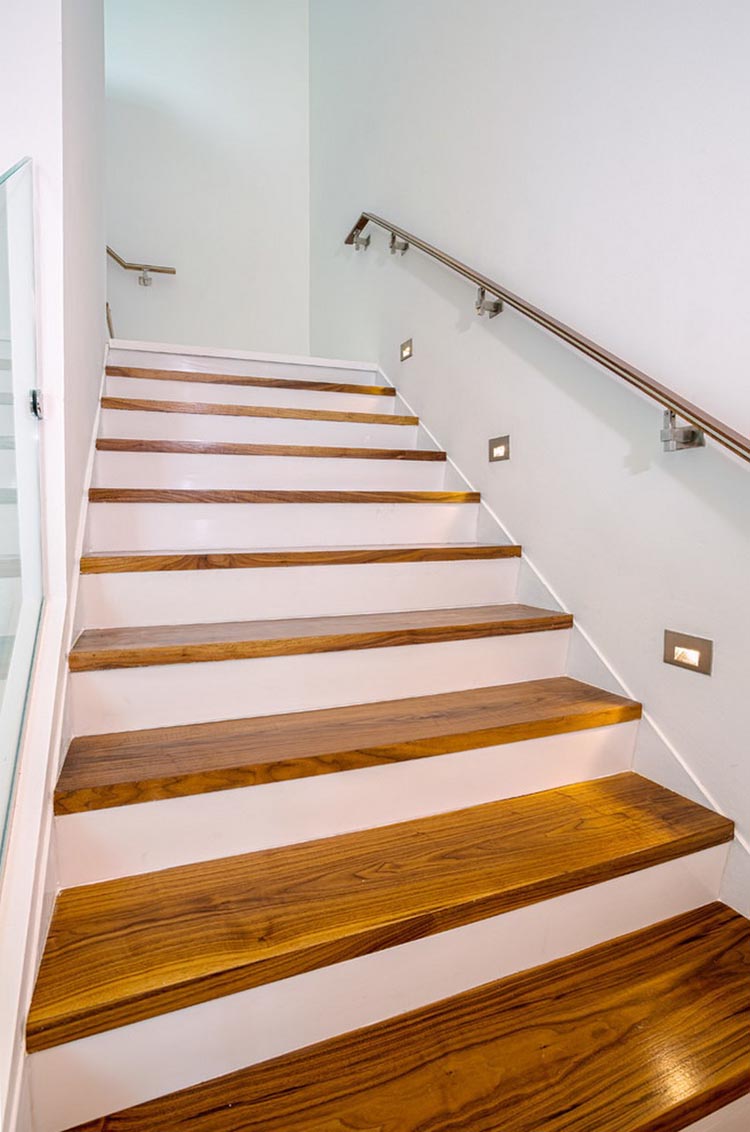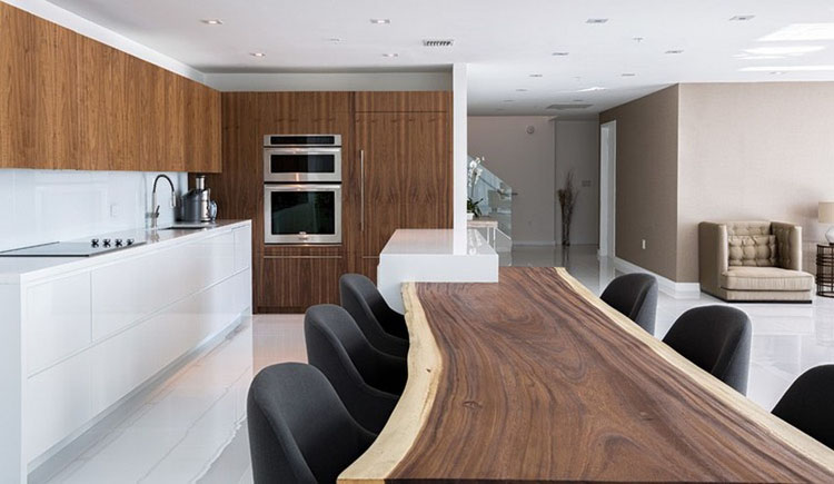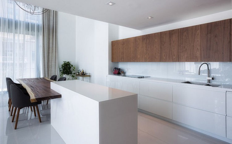 設計師在這個兩層的複式空間中所著重展示的是耐人尋味的裝飾材料以及極具視覺美感的混合紋理,米色與灰色的碰撞使整個空間產生一種柔美的基調,素雅與時尚兼具。雙高度的裸露混凝土天花和大紋理的實木板材家具又給人些許的粗獷美,這也是整個設計優雅和平衡最重要的地方。設計師在餐廳區域采用原木和加強紋理的方式展示公寓個性的一麵,本就開敞、自由的空間再加上自然光照使整個公寓看上去更加寬敞明亮,更有視覺空間感。