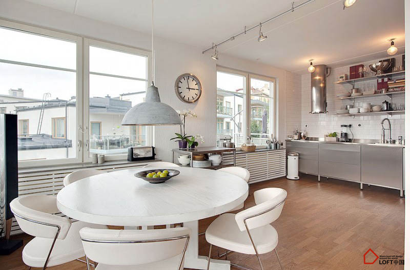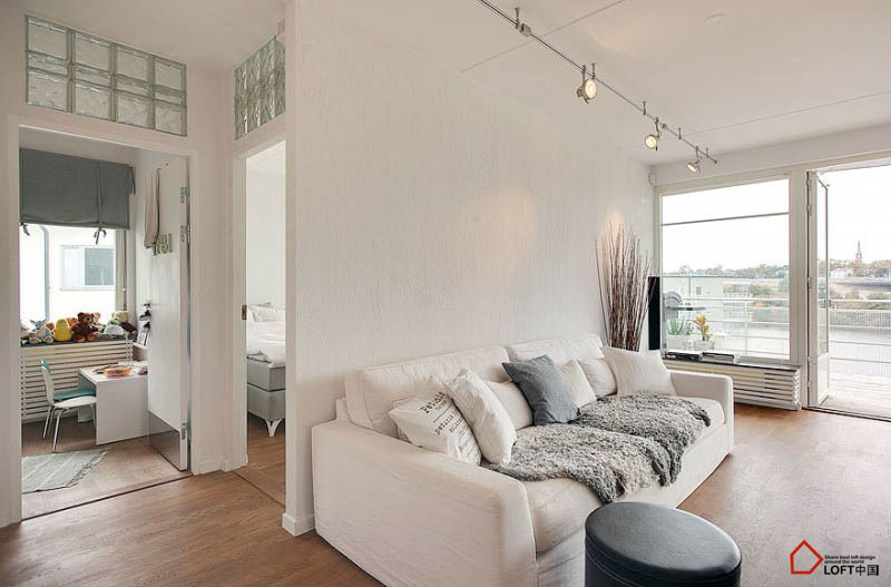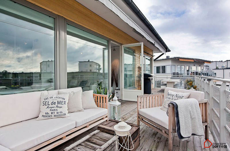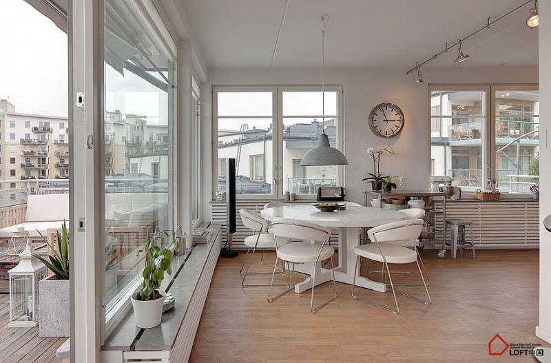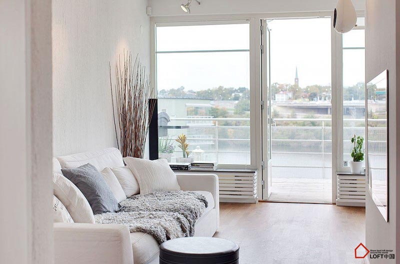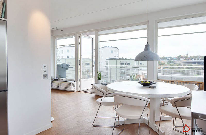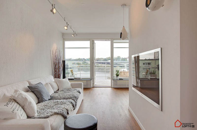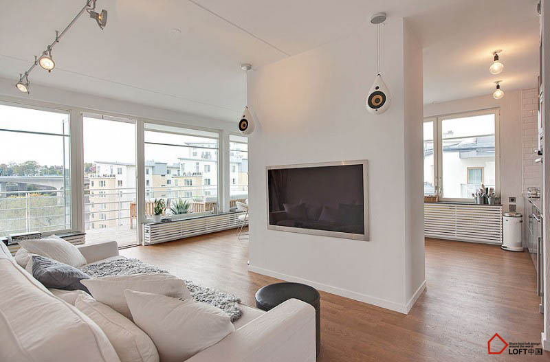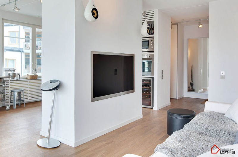 公寓位於一個車庫的頂層,是Lilla Essingen島出售的最獨特、最具吸引力的公寓之一。公寓在2011年進行全新改造翻新,擁有77㎡的室內麵積和30平米的觀景陽台麵積。整個公寓的設計時尚、潔淨,純正的北歐風格。公寓內部采用開放式的布局,客廳和廚房、餐廳之間用電視牆做隔斷,電視牆且同時兼具隱藏櫥櫃的功能。寬敞的客廳空間具有良好的采光效果,而且與觀景陽台能形成很好的互動。