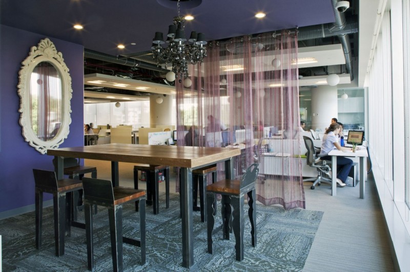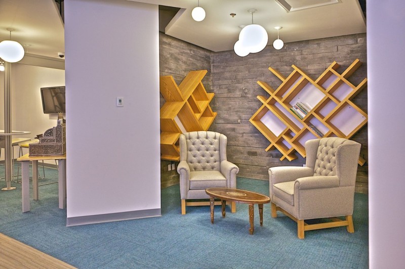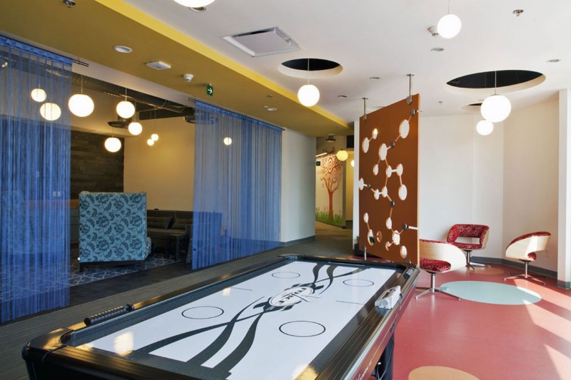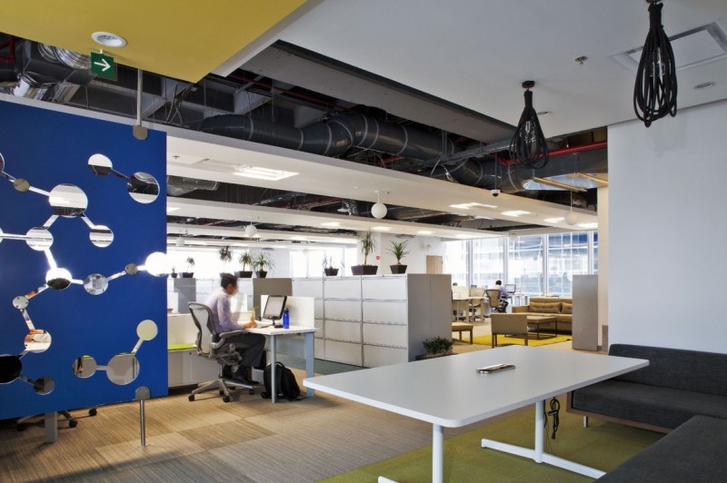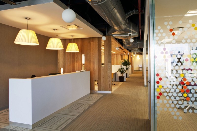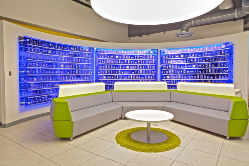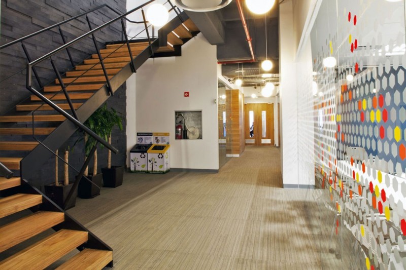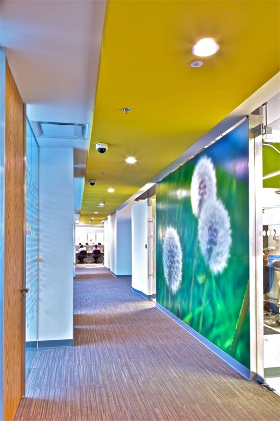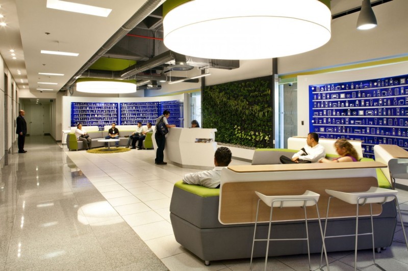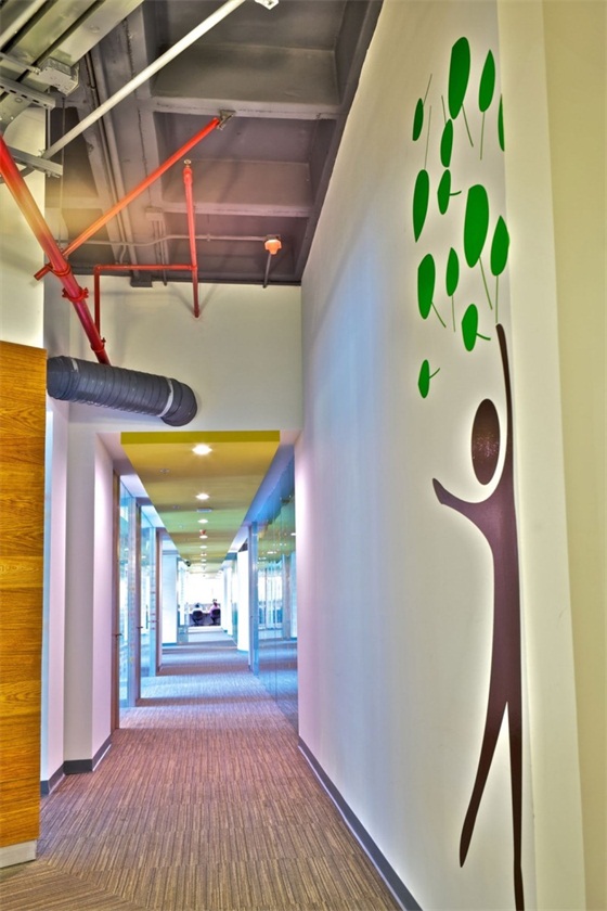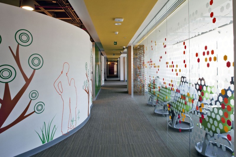 辦公空間的設計簡約時尚而充滿童趣,走出電梯間便是一個圓形的開敞式接待區,接待區兩側是由兩個藍色玻璃組成的展示牆,玻璃上繪有聖巴勃羅集團的藥品產品外形樣式,接待區的中間區域是以綠色植物為背景的接待台。走廊兩側的牆壁上繪畫著抽象的圖案,圖像有著積極向上和強勁生命力的寓意,符合聖巴勃羅集團的企業文化。在工作區設計師打破了千篇一律的工作形式,營造了一個輕鬆,寬敞,開放,點綴著休閑元素的辦公環境,家具的高度被刻意的降低,目的是為了讓所有的工作人員都能享受自然光和戶外迷人的景色。