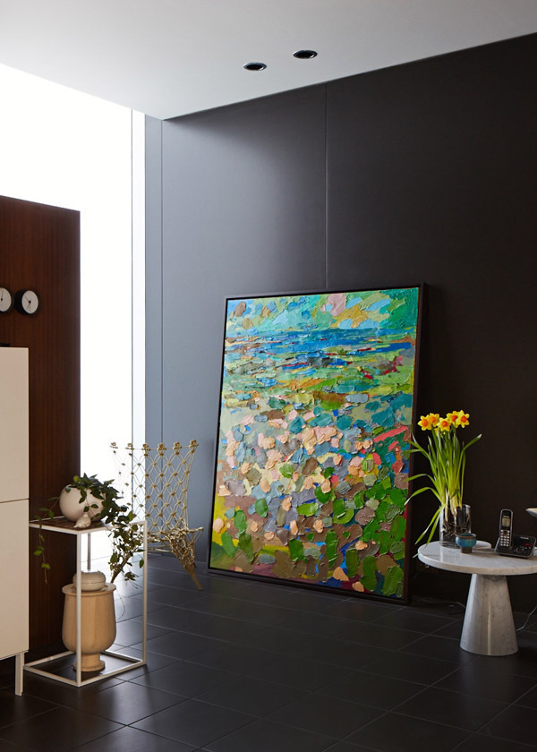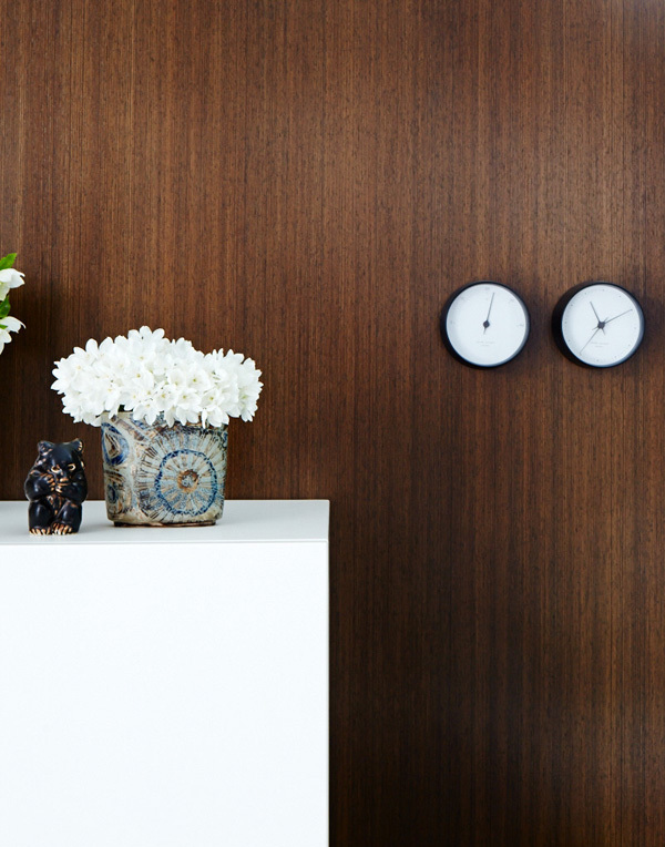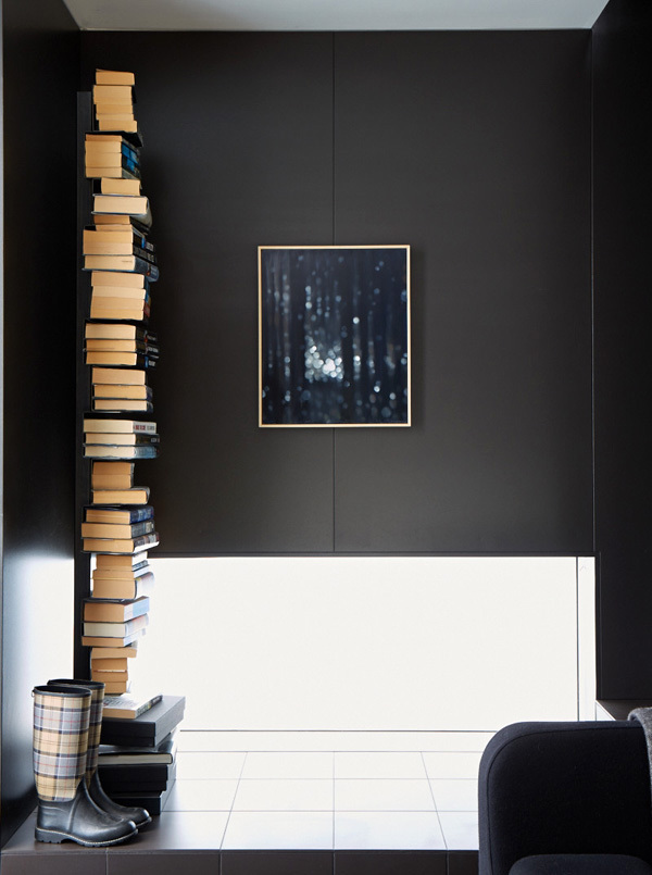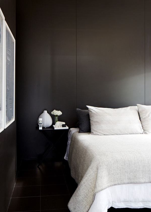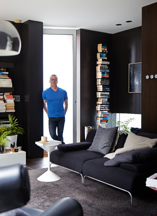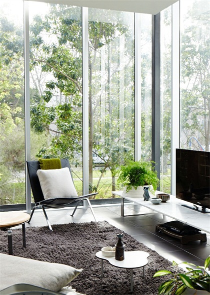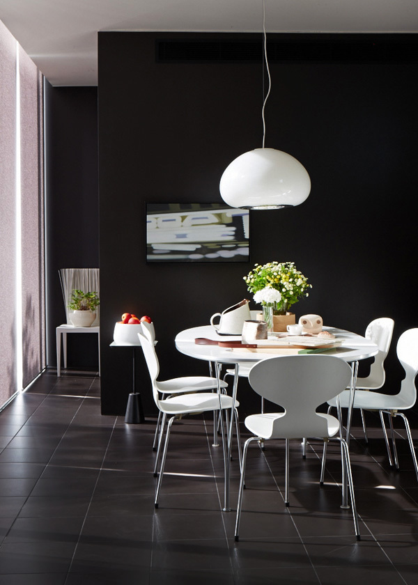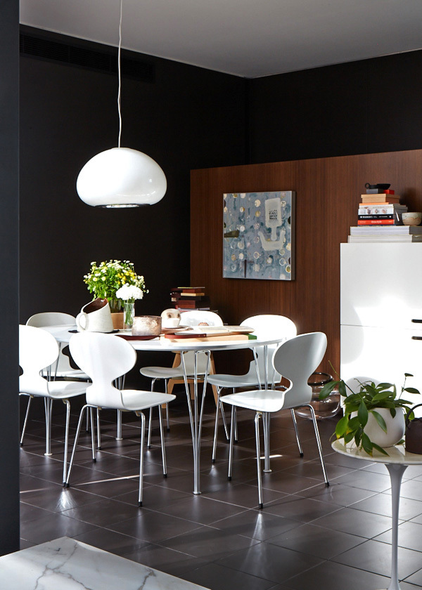 這是一個時尚而現代的公寓設計案例,設計師為Hecker Guthrie。公寓整體設計顏色對比強烈,牆麵為深棕色和深色木飾麵(部分),地麵為深色地磚,大部分家具、燈具和飾品則為白色。黑與白是時尚風潮的永恒主題,強烈的對比和脫俗的氣質,無論是極簡、還是花樣百出,都能營造出十分引人注目的居室風格。綠色植物的點綴使空間更顯得靈動和充滿生機且與室外能交相呼應。