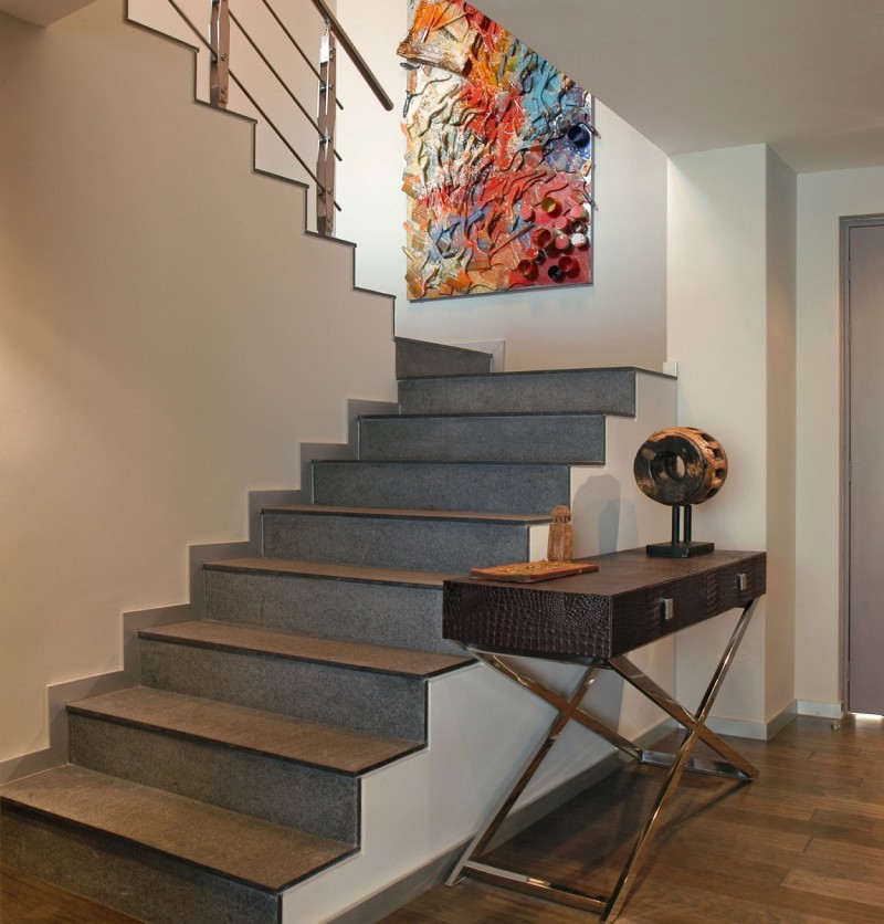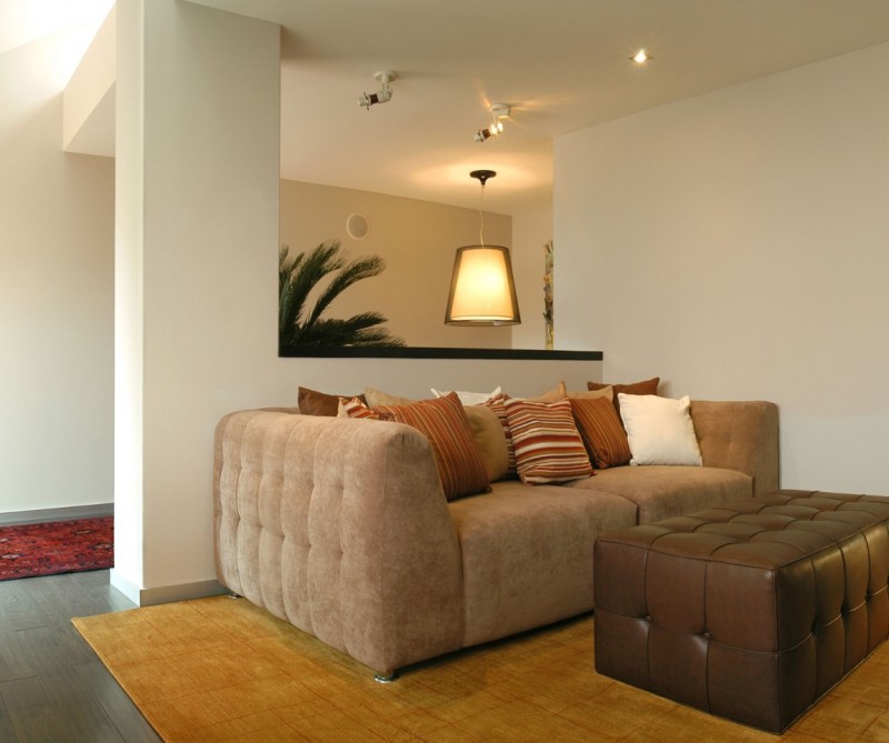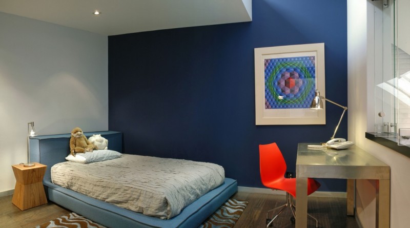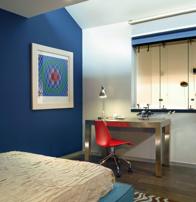 客廳、餐廳空間能通過位於兒童房的窗戶和公寓頂部的天窗獲得充足的光照,燈具的選擇同樣別出心裁。位於樓梯緩台牆上的油畫是個很棒的創意,它是靠很多的繪畫工具拚合在一起製作而成的,公寓內的每一個細節處理都是設計師在符合公寓主人的要求內精心設計和製作出來的,包括樓梯的細節處理,燈具的選擇,純手工製作的地毯,兒童房的顏色處理以及主臥空間的書架製作等。