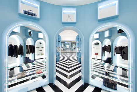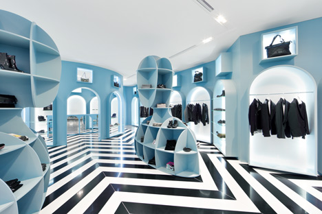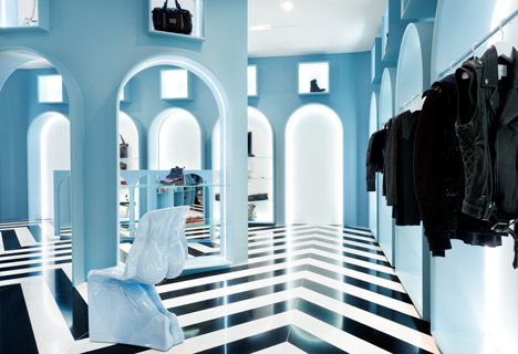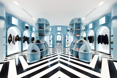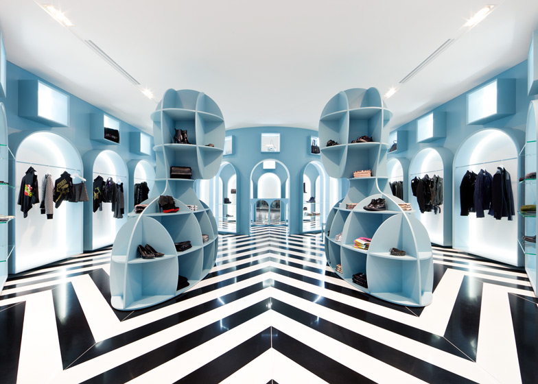 商店中拱形線條的三麵牆壁,每一個包含了懸掛的衣服或置於玻璃板上的鞋子、包袋。其中一麵弧形牆壁上,打造了許多拱門,它將收銀台與商店其它空間隔開。靠近商店櫥窗的牆壁,設置一定的角度包含了一側的柱子和扭曲的視線,從而創建出完全對稱的空間布局。