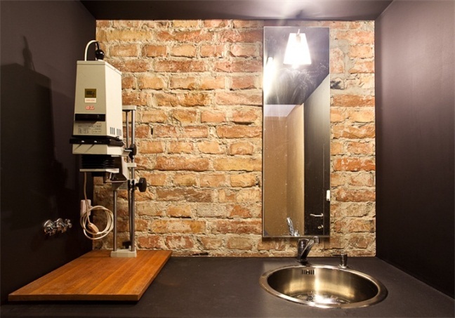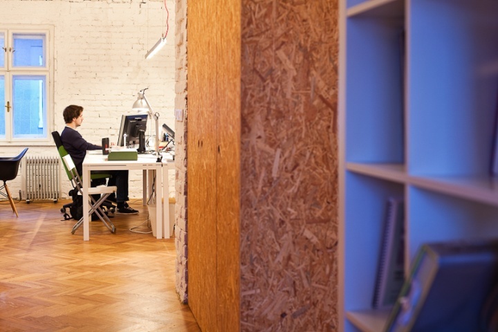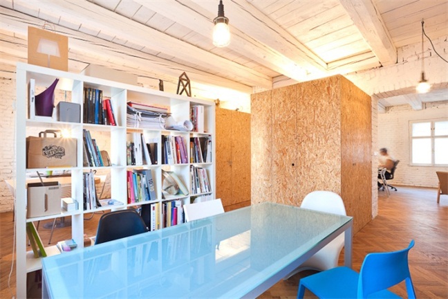 工作室位於建築的第四層,是一個粗狂的木質天花板和沒有集中供暖的磚混結構空間。工程的預算不超過7500歐元,所以這是一個需要智慧的設計項目。設計師們首先是拆除不需要的牆體,在原有的牆麵上隻是粉刷了白色的塗料,為了盡可能少大麵積運用裝飾材料,所有的空間之間隻有一個分區,它們之間被兩個用刨花板做的木箱子分割開來,一個主要是放打印機和材料樣板,另一個是存放日常所需和衣櫥,同時也被創意性的放置了衛生間設施、廚具設施和浴室。