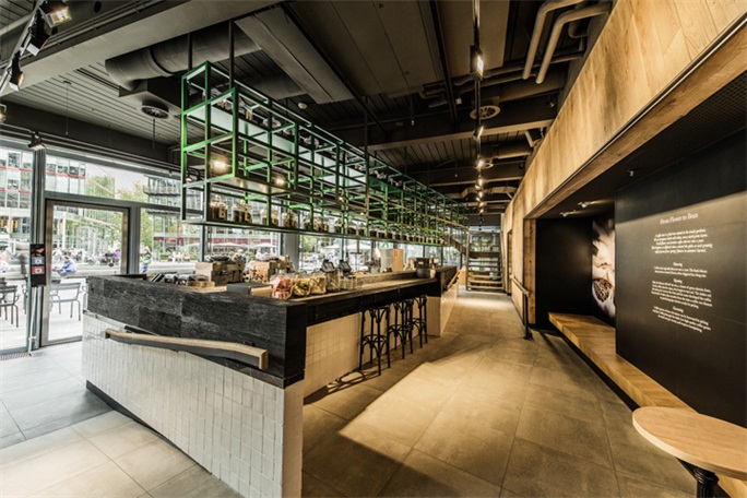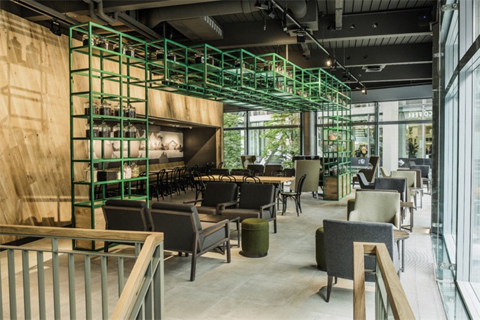 星巴克索尼中心店麵位於Potsdammer廣場北部的一塊三角地上,星巴克店麵設計是基於周邊的現代建築。店麵最引人注目的是綠色的不鏽鋼框儲藏架,上麵放置著裝滿咖啡豆的玻璃瓶子,具有很好的展示作用。天花沒有做特殊的處理,隻是被刷成了灰色,裸露的鋼梁結構和通風設施有很強的工業建築的味道,與香醇、柔潤順口的咖啡形成鮮明的對比。