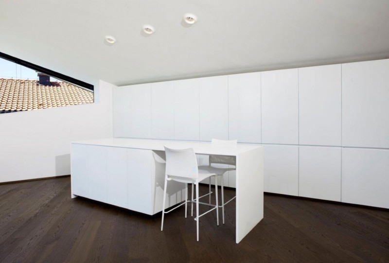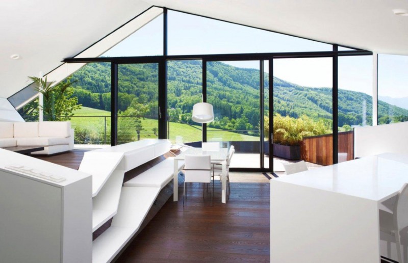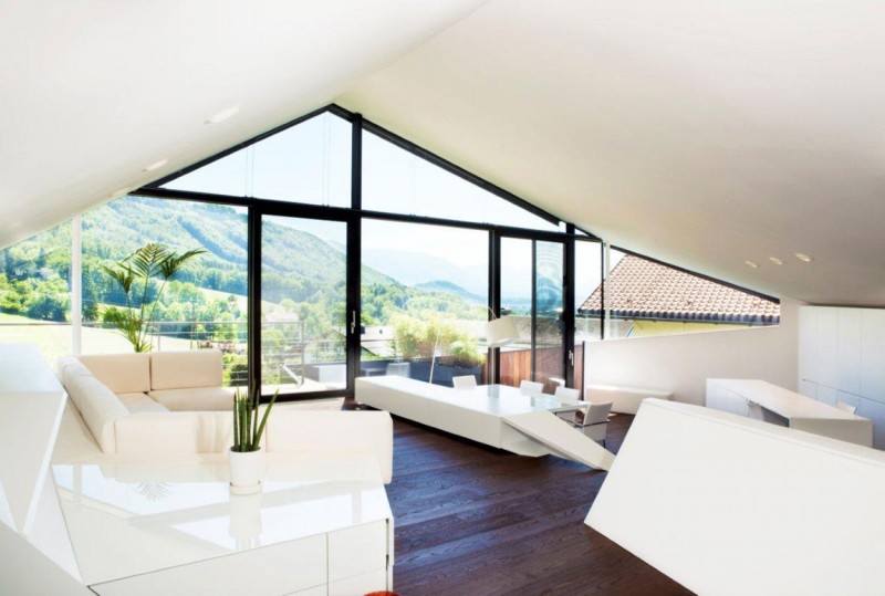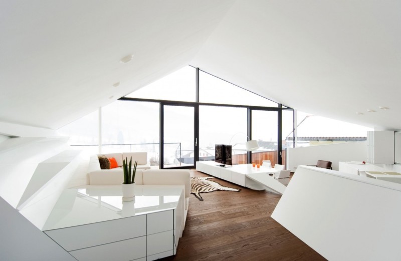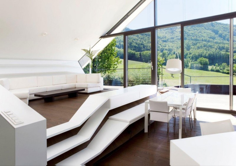 Villa H私人別墅位於奧地利薩爾茨堡,Smartvoll Architekten ZT KG建築設計事務所設計。Villa H別墅設計時尚前衛,建築外觀為異型結構,大坡度的屋頂及屋頂瓦塊的運用是為了能使建築整體與周圍舊建築相融合。室內設計的主色調為白色,部分家具的設計也是采用的異型造型,與建築本身的設計更協調統一。