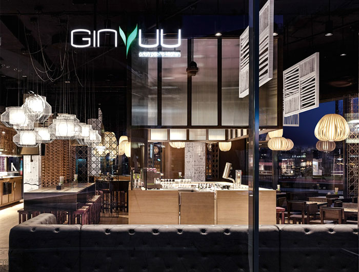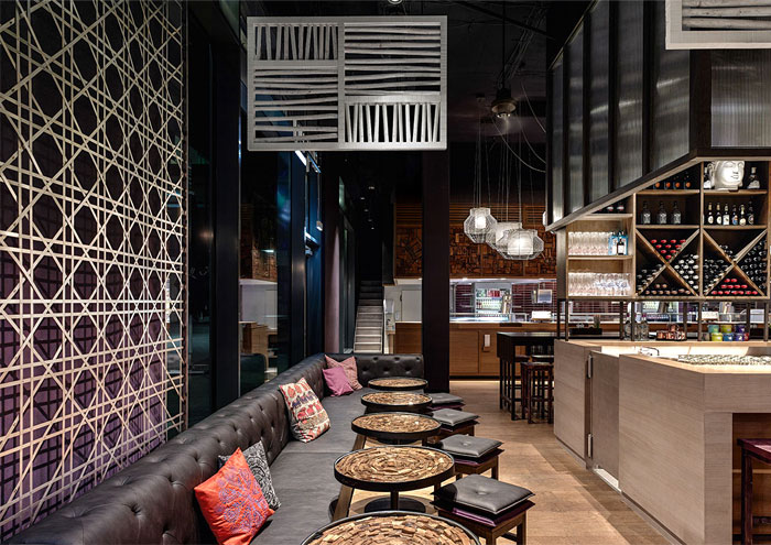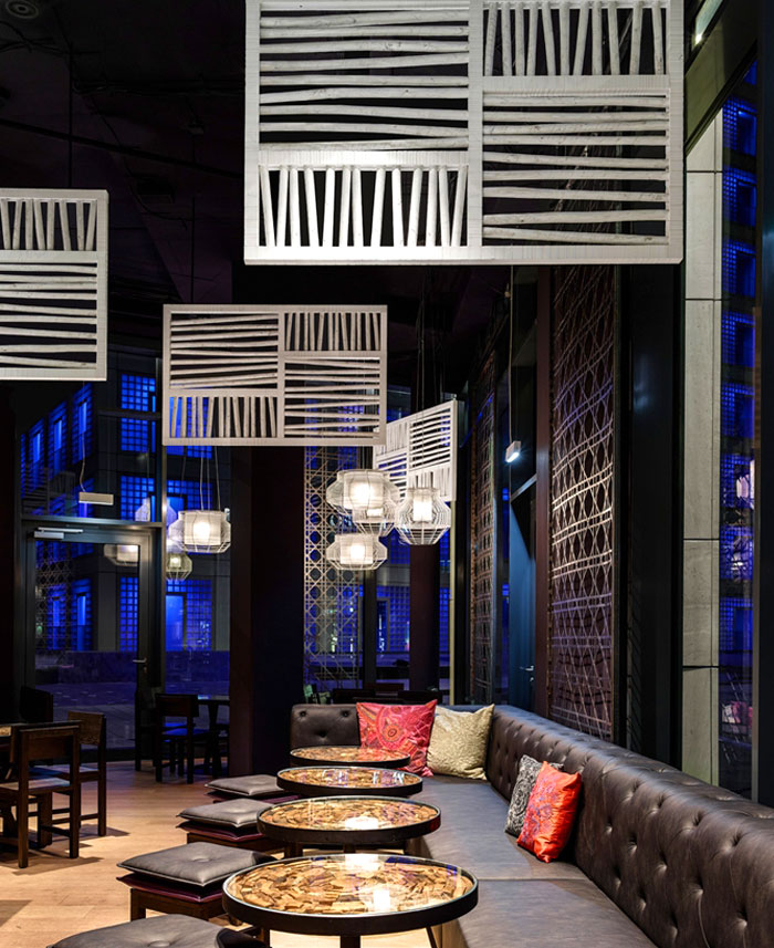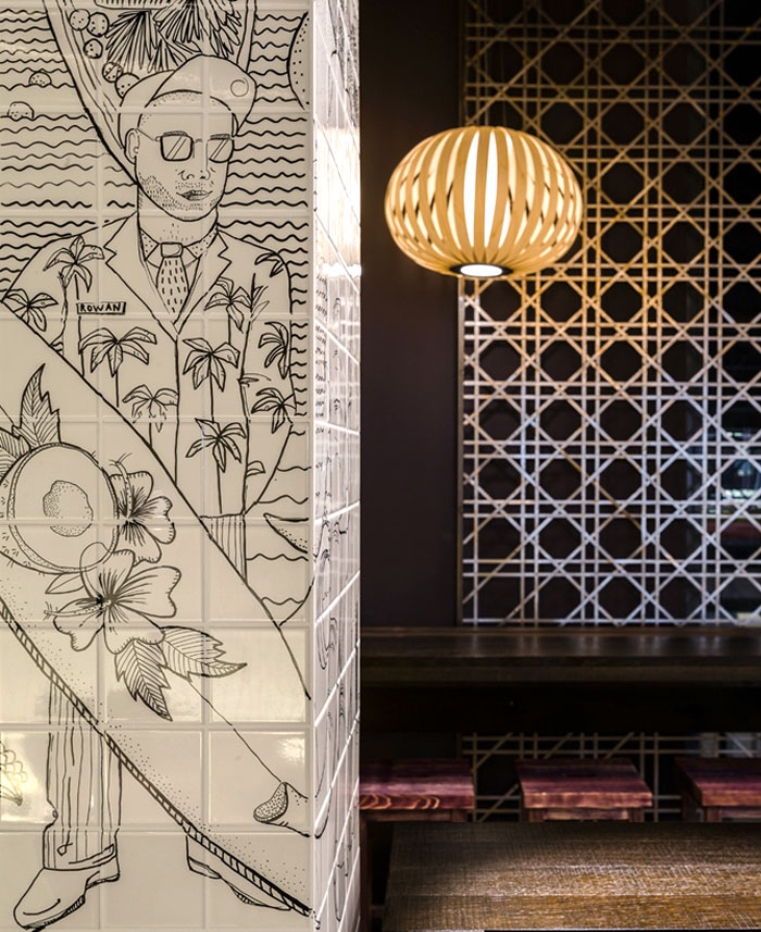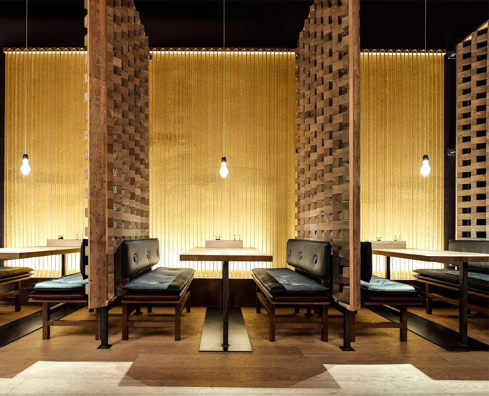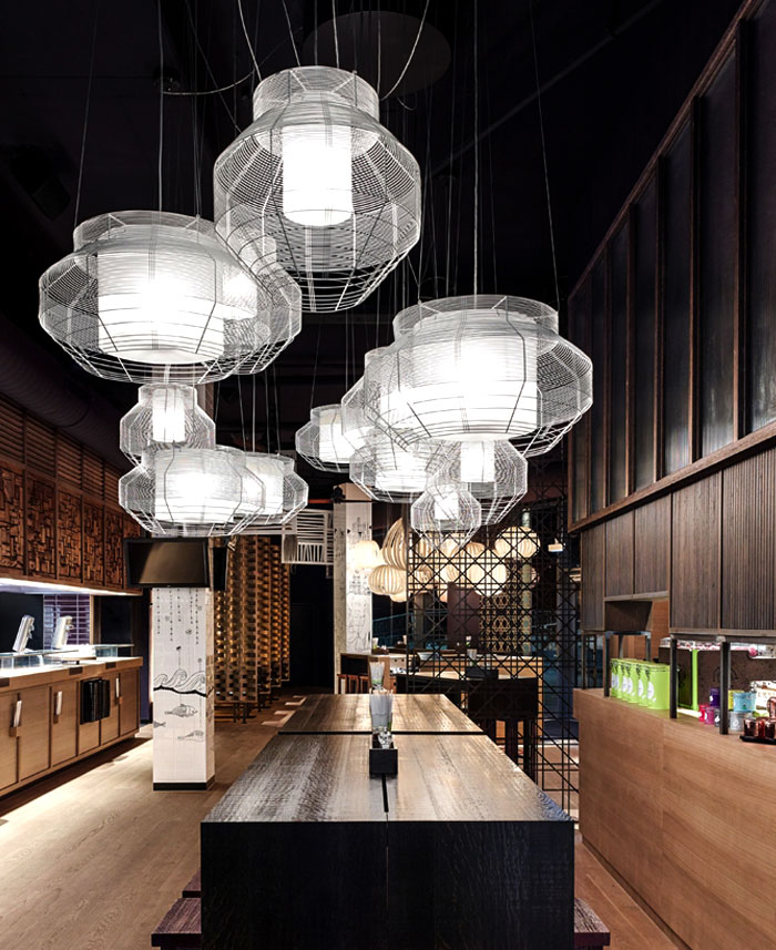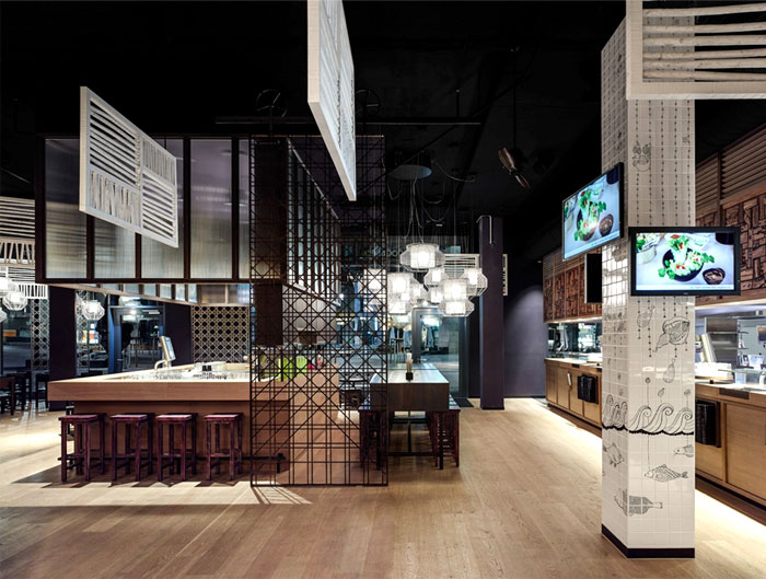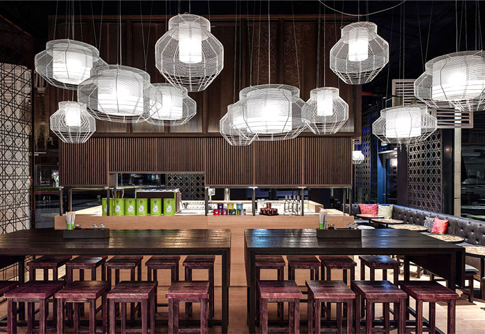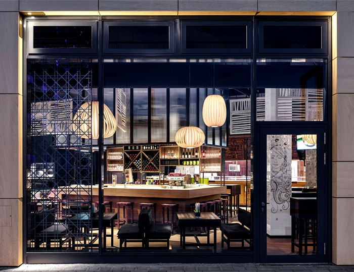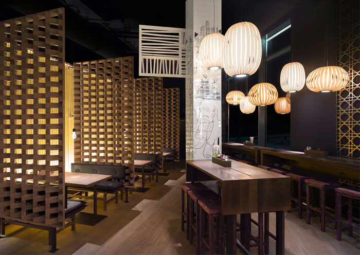 Ippolito Fleitz Group設計師使用華麗的木飾麵,強烈的色彩和插畫家Claudia Wagner設計的圖案的陶瓷瓷磚成功的塑造出現代的、難忘的新亞洲風格餐廳。入口處是特別定製的接待桌,接著就是浮木櫃台、造型簡單的桌子、用繩子懸掛起來的百葉窗和各種陳設,這樣的設計產生有趣的同時放鬆的氣氛。