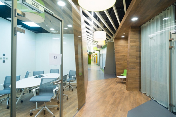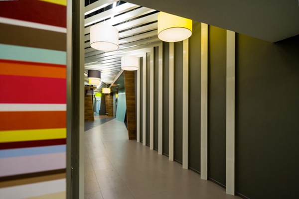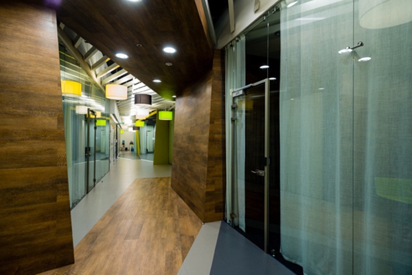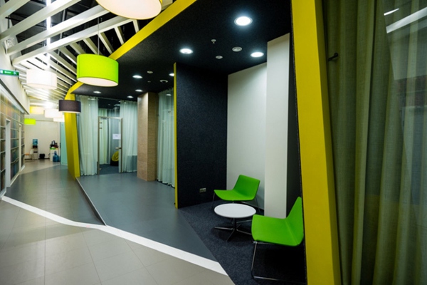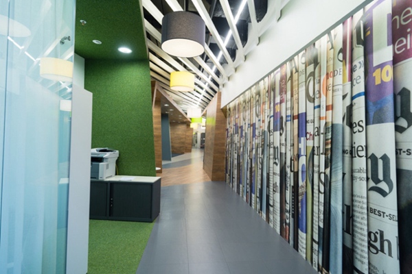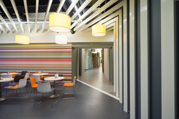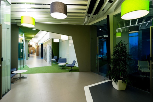 這間辦公室位於聖彼得堡Benois商務中心,由Za Bor Architects 建築設計事務所設計,是Yandex公司在聖彼得堡辦公空間擴展項目的第三個階段。辦公室的設計色彩豔麗,在狹長的走廊中融入了很多有意思的元素和複雜的建築幾何形態。所有的室內裝飾用材均為合成材料,可以滿足最高的生態和消防安全的要求,油氈及寫真壁紙穿插在走廊、餐廳及圖書館之間。天花則為比較寬大的白色格柵,既滿足裝飾的需求又具有吸音的效果,彩色的燈具均為適合整個場景的定製產品。