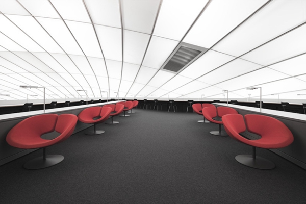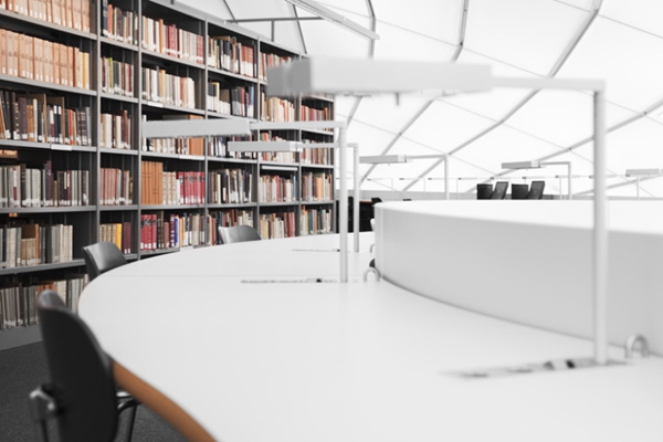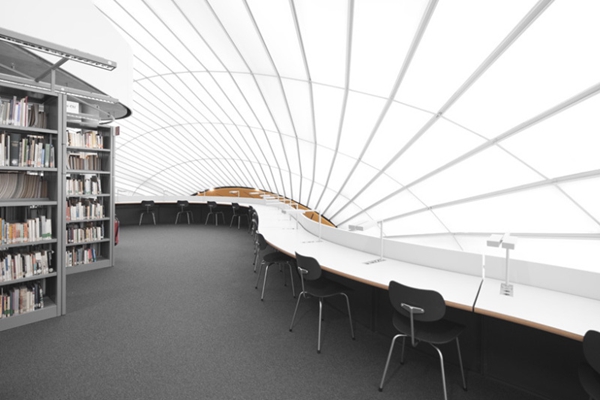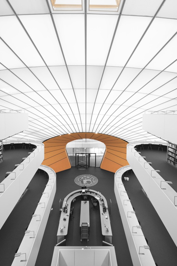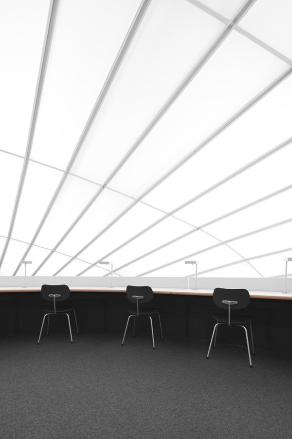 德國柏林的philologische藏書圖書館由Norman·Foster設計,Norman·Foster設計的 “philologische藏書圖書館”,是柏林自由大學最新的項目。整個頂麵猶如一個巨大的罩子,橢圓形的白色膜結構照明將室內自然均勻的照亮,優雅的網格框架讓頂麵看起來及輕盈但不單薄。開放式的敞開空間內,各個樓層如同一層層明快的白色綢帶將休息閱讀區和書籍存放區自然的劃分開來。整個圖書館獨立而整體,照明係統及休息閱讀設施為讀者提供了優質的閱讀環境。從橢圓形的屋頂、曲線書桌及顏色跳躍的椅子可以看出設計師擁有自己獨特的審美風格。