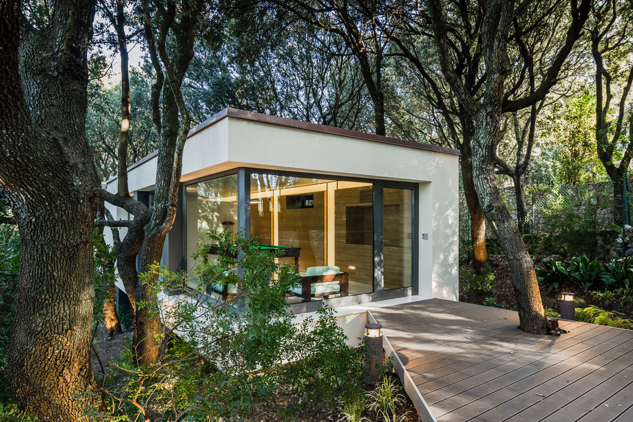 在意大利•薩薩裏茂密的森林裏, Casa nel Bosco 邀請Officina Architetti 設計團隊設計了這間小屋,屋子成長方形,承重牆被落地窗取代,屋外樹影交錯映射進屋內,簡潔大方,現代感十足的空間設計。