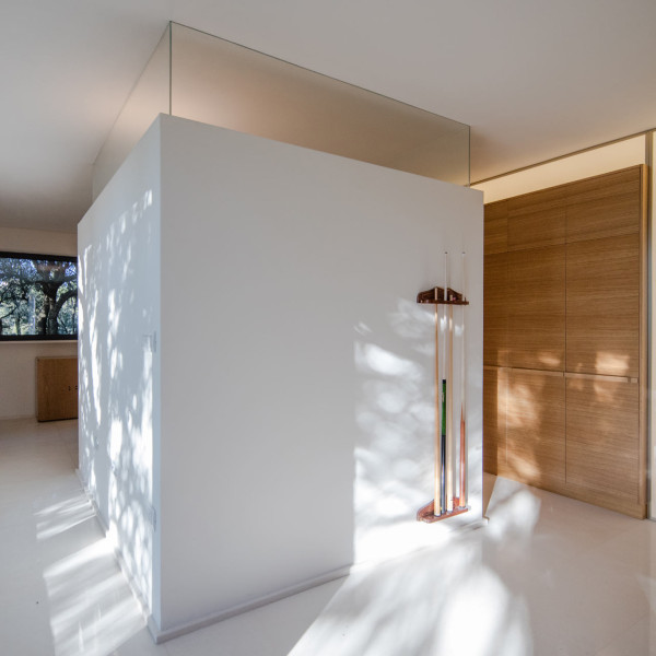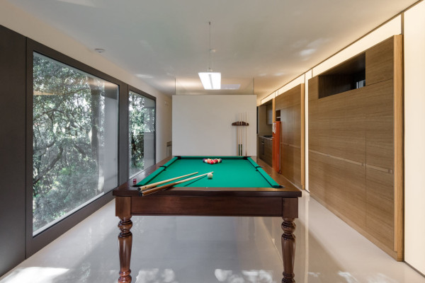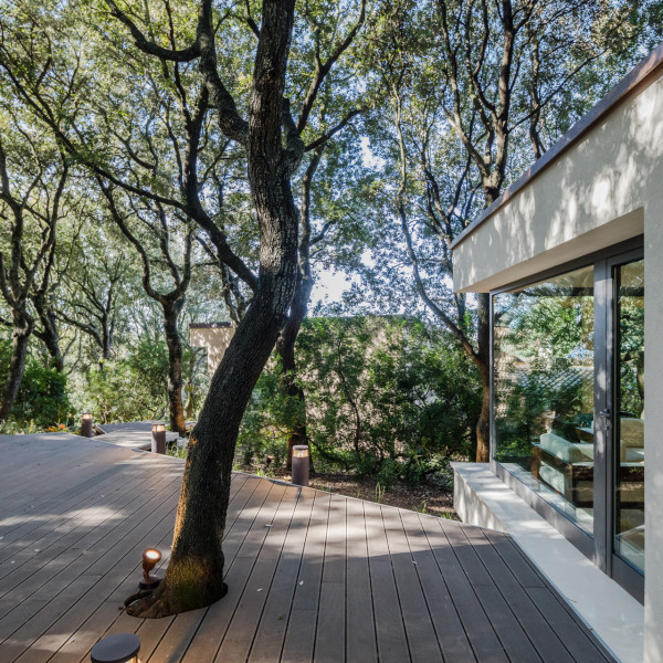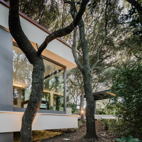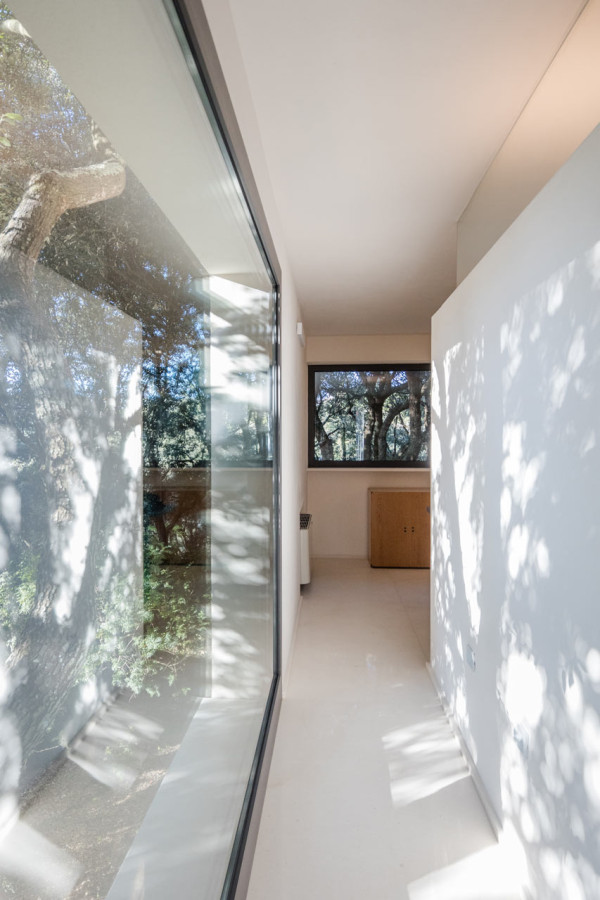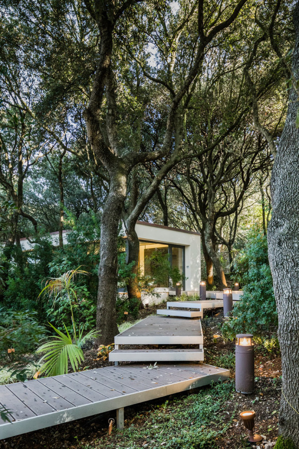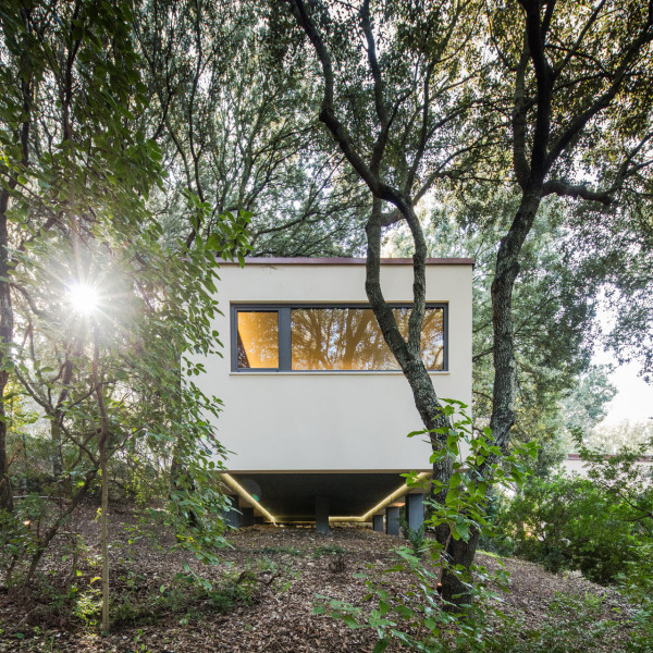 蜿蜒曲折的小路直通小屋的大門,跟著小路慢走,帶你領略神秘森林的風景,設計團隊對建設地進行了細致的考量,在不傷害任何一顆樹的前提下,最大化的利用現有的麵積,鋼筋混凝土的柱子支撐著整個建築,生命力頑強的小生命就可以在宅子的下方肆意生長。室內的設計盡量簡單化,不與窗外的風景爭奪光輝。