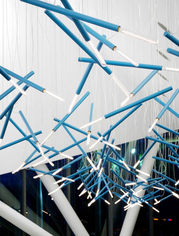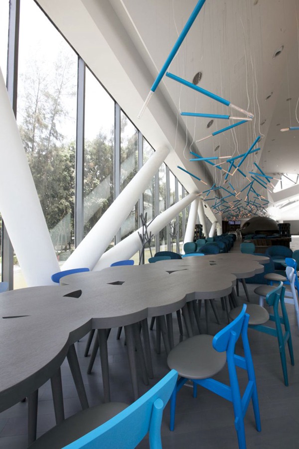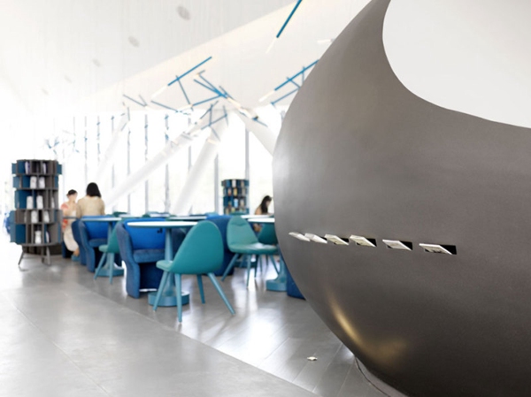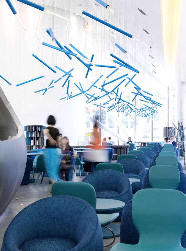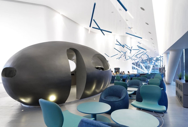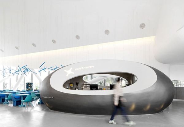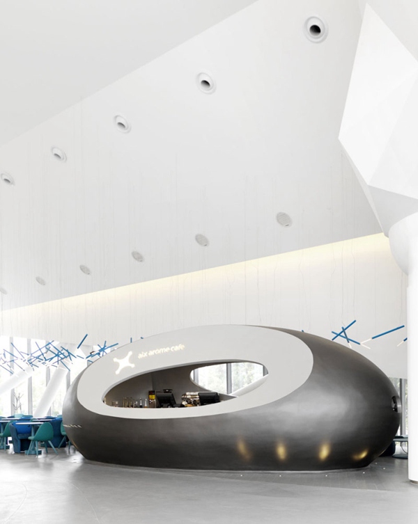Aix Arome咖啡廳設計風格現代時尚,最引人注目的是灰白色的蛋形結構吧台,其實它的原型是咖啡豆。圓滑的線條和外形,搭配地麵向上的射燈燈光,充滿了科幻感。一排排深藍色的圓形桌椅分布在吧台旁邊,其上則懸掛著一排排藍白相間的創意吊燈,與桌椅的色調保持一致,色彩的搭配協調、舒適。寬大的玻璃窗則為咖啡廳提供了充足的光照。