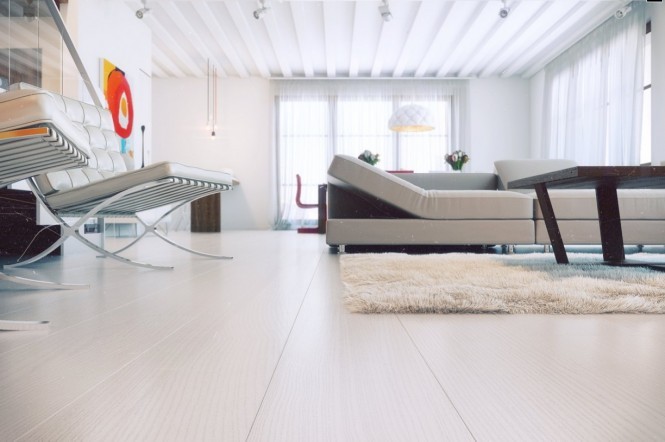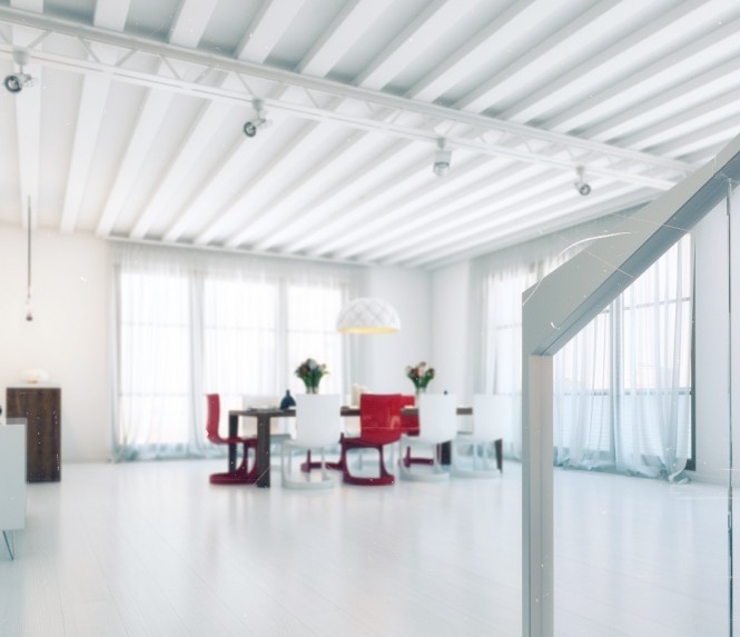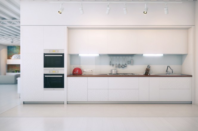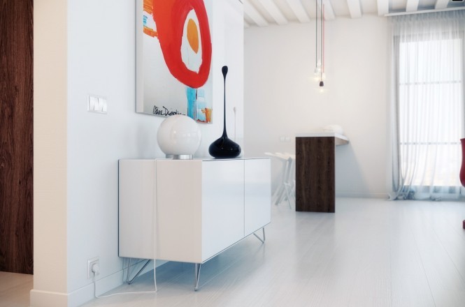 一個猶如畫廊般充滿活力色彩的住宅空間設計,設計師在以白色為主色調的設計中加入了隻有調色板中才會有的豐富色彩,裸露的紅磚磚牆、邊櫃上的掛畫、餐椅等具有體現。與鋼架結構相結合的軌道射燈給室內空間增添了工業廠房的感覺,生活區全開放式的布局更容易獲得多變的空間,也有助於增進空間內生活的個體之間的交流和完美的協調。