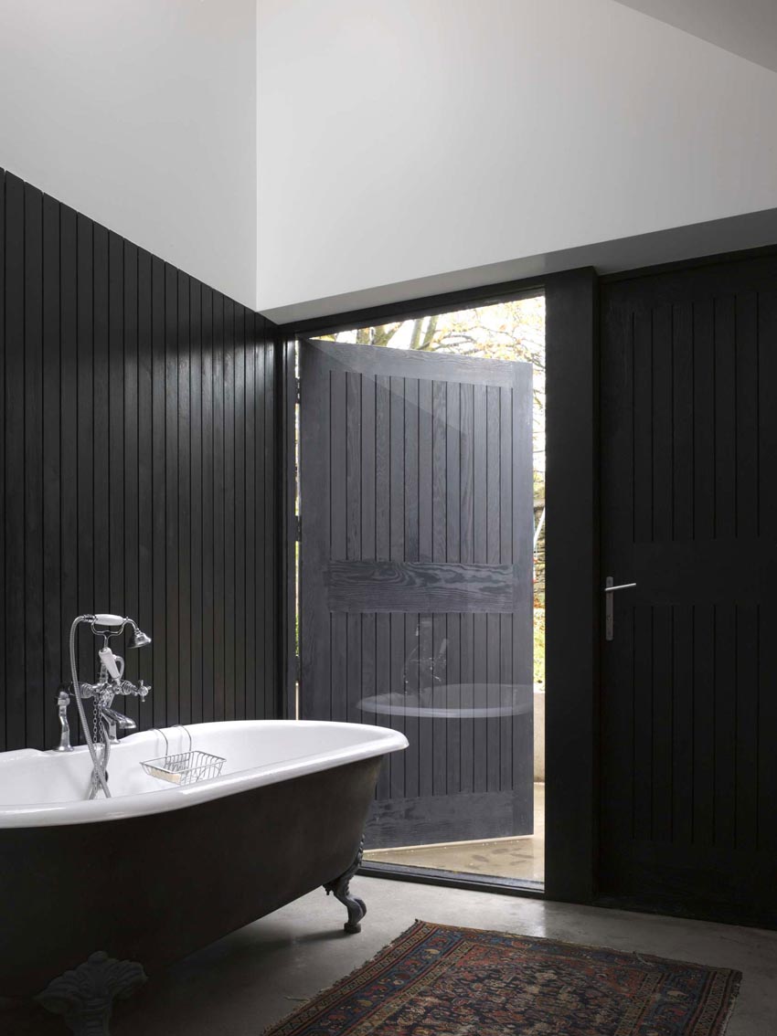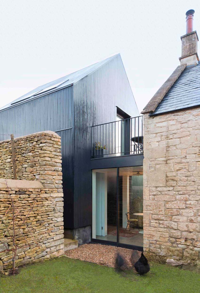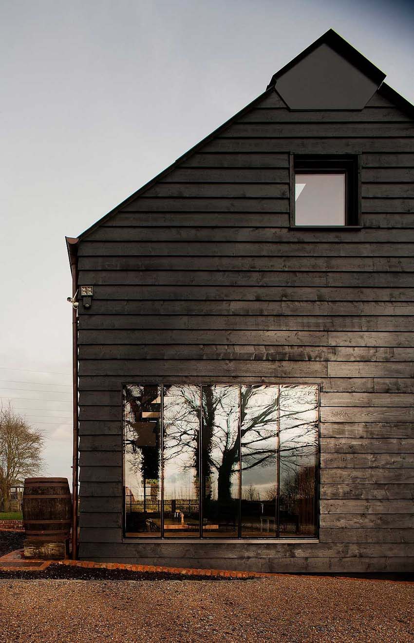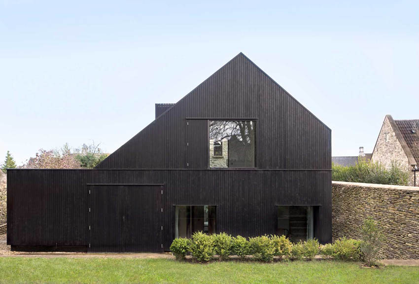 用塗黑的落葉鬆木材裝飾的房子,人字形屋頂和威爾郡特小教堂的高牆,原始棕色木材結合著黑色元素,充滿個性。夾樓走道的玻璃通道連接著空間前方的廚房、客廳和新修的臥室和浴室。