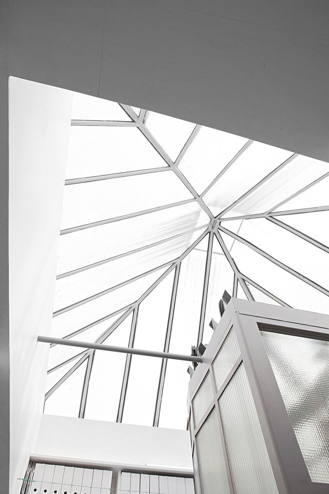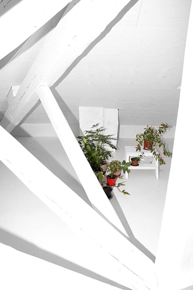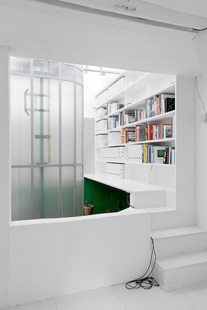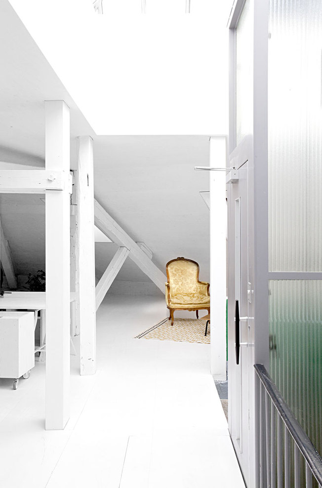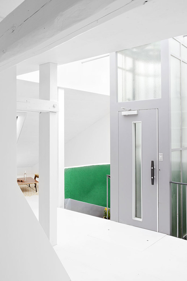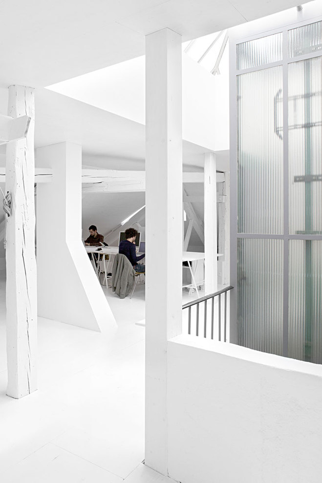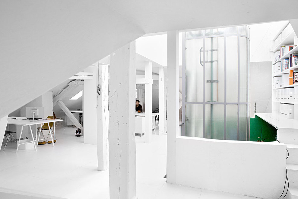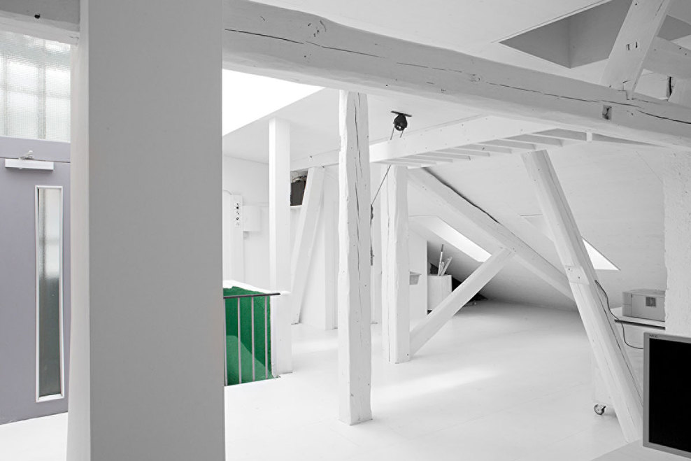 閣樓內部通過房頂的天窗進行采光,再加上整個白色的空間,室內具有良好光線效果。空間保留了原建築的木結構屋頂結構,交錯的木梁天然的形成了一個個獨立的小空間,工作人員“棲息”在閣樓內的各個角落,一個屬於自己安逸私密的小天地中。BUREAU A office通過一部電梯直達,一個很具有禮儀性的入口。