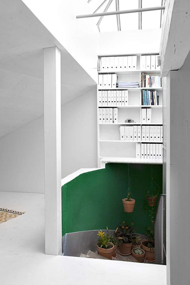 BUREAU A office位於瑞士日內瓦一間19世紀的閣樓公寓內,其室內白淨的一塵不染,隻有些許的綠色做點綴。BUREAU A office其實是一個SOHO空間,有點類似於本站曾介紹的首爾HUB創業集聚地。