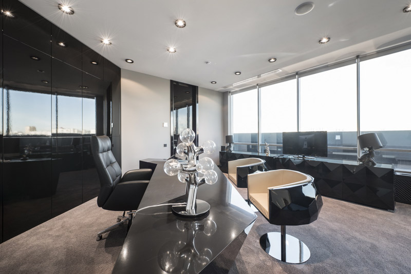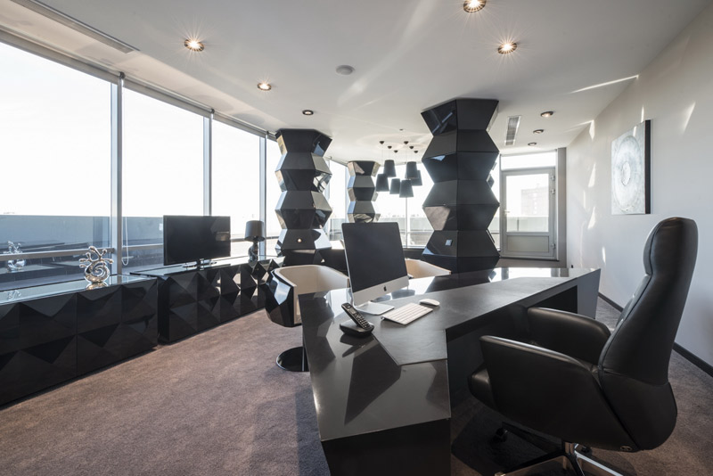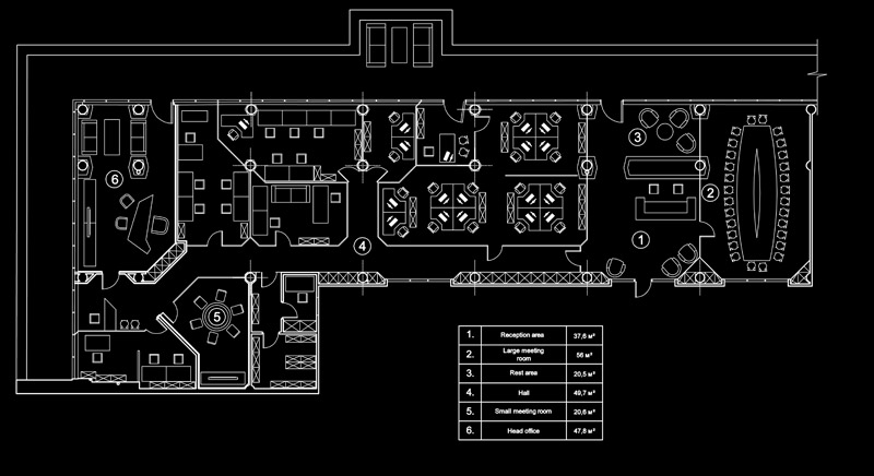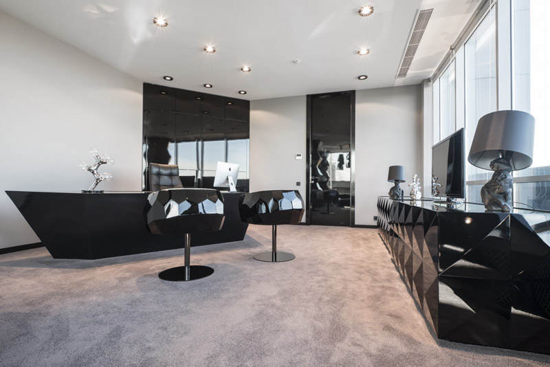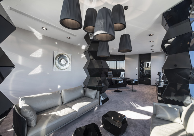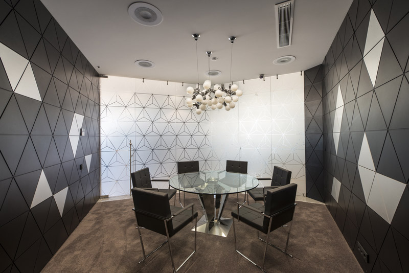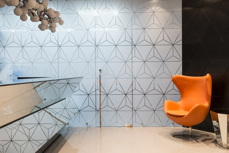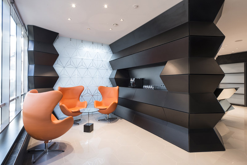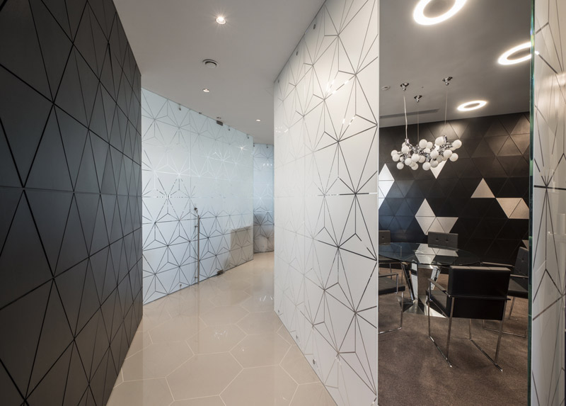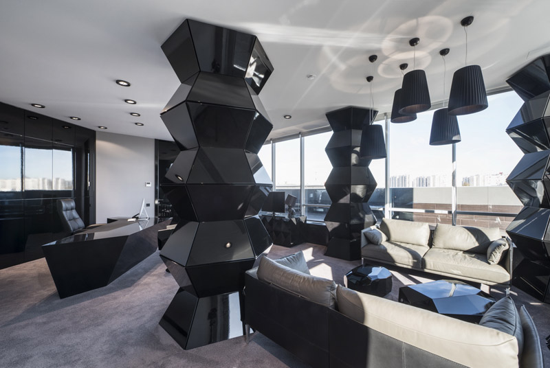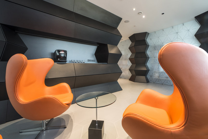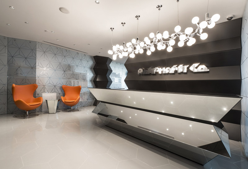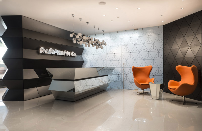 這是莫斯科一間現代感十足的辦公室,建築麵積為440平方米,由Geometrix事務所設計。辦公室的內部裝飾反複運用了六邊形的設計元素,包括:牆板、玻璃隔斷、接待台、柱子、座椅等。