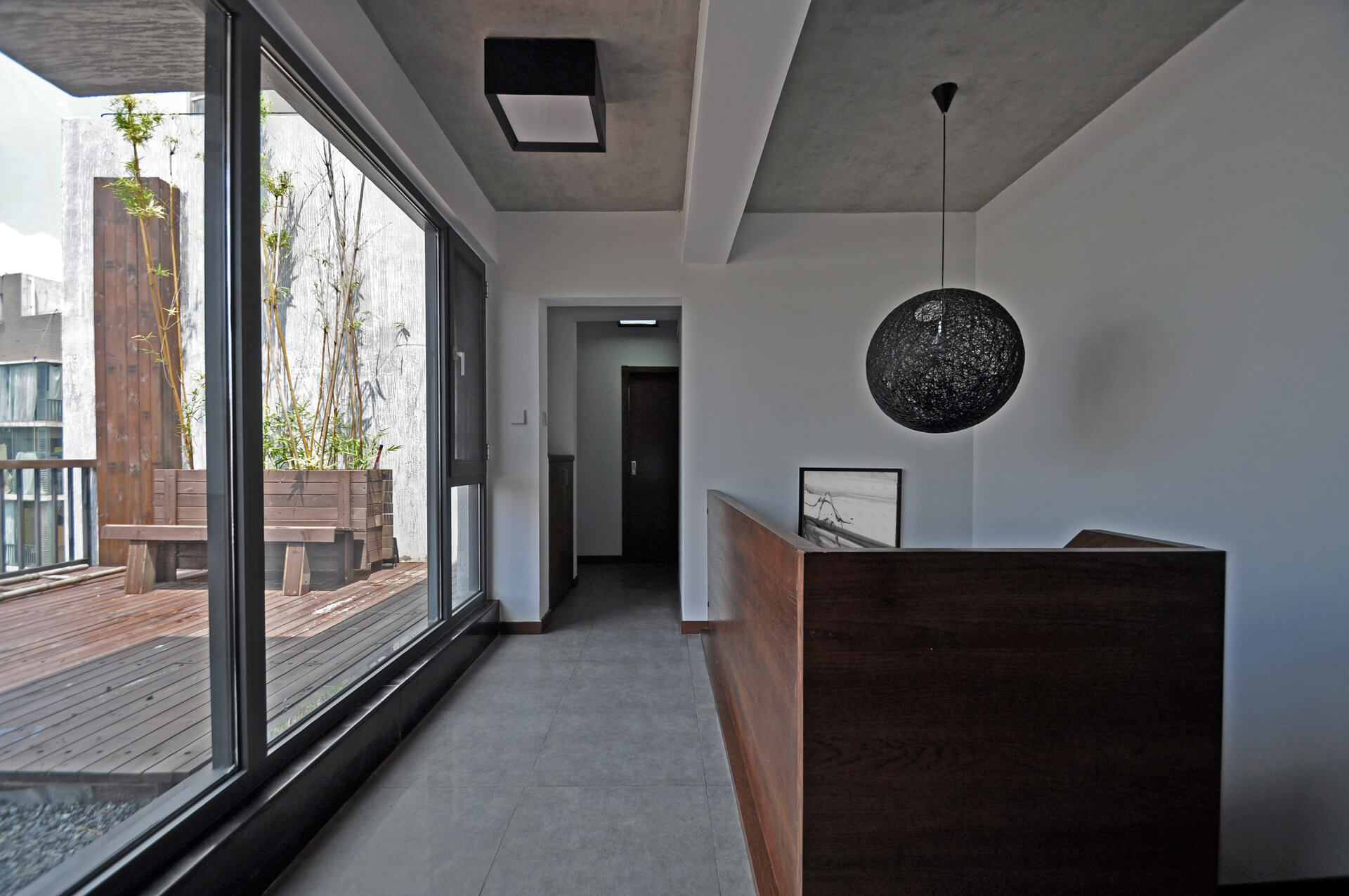 Transparent corridor space connects both inside and outside, large open windows bring the outdoor environment into the interior form the terrace, and the green planting embellishment creates a feeling of internal and external intermediation.