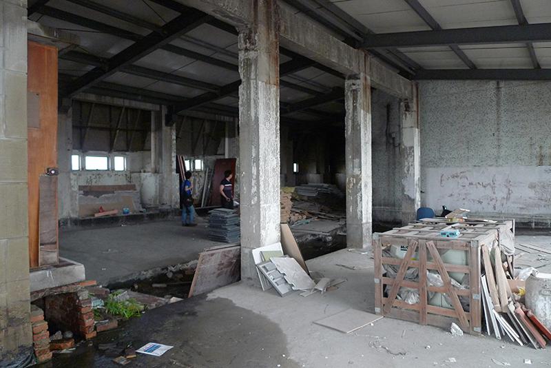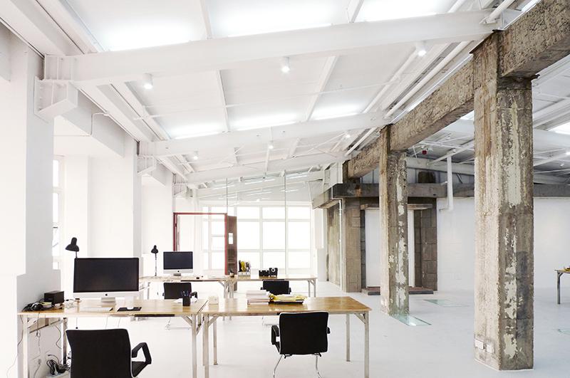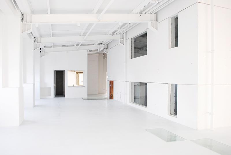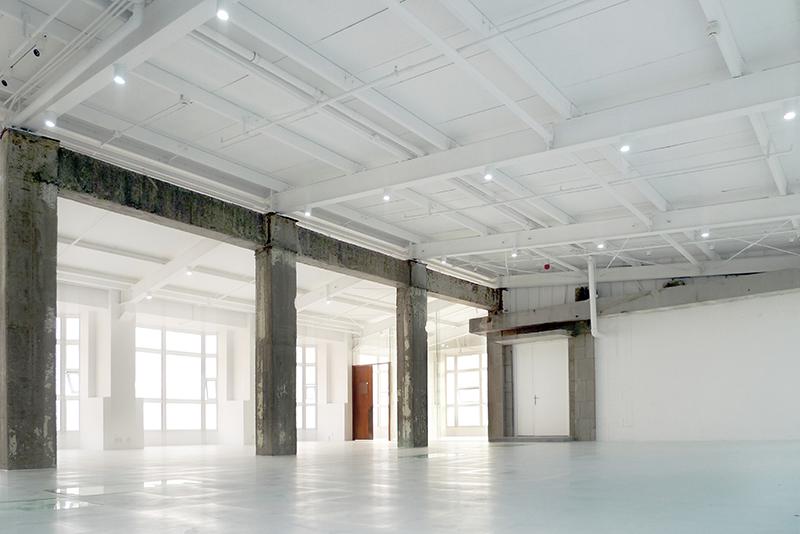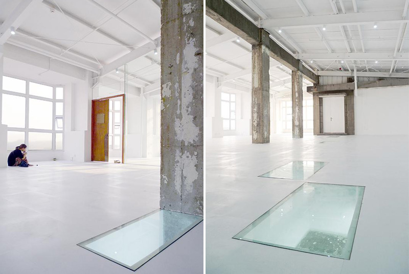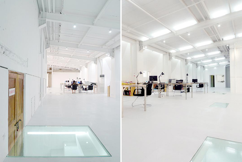 為了彰顯正統建築語言與建築“方言”之間互動並行與辯證關係,設計保留、改造了一係列能夠揭示其原有搭建的“非職業”的設計元素:鋼構架屋頂通過白色噴漆處理,使原有鏽蝕的混凝土梁柱依然作為結構核心被完全保留;房間采用架空的白色地膠板,五個鏤空設計的地下櫥窗玻璃鑲嵌其中,展現了原有粗糙傾斜的排水屋麵;從屋頂到倉庫,從廢棄到重新利用,疏散門的雨棚和粗糙的馬賽克牆暗示著這片空間定義的變遷。