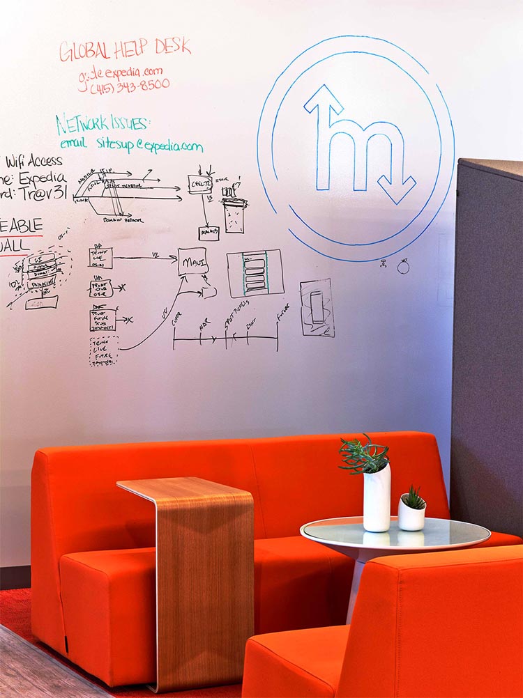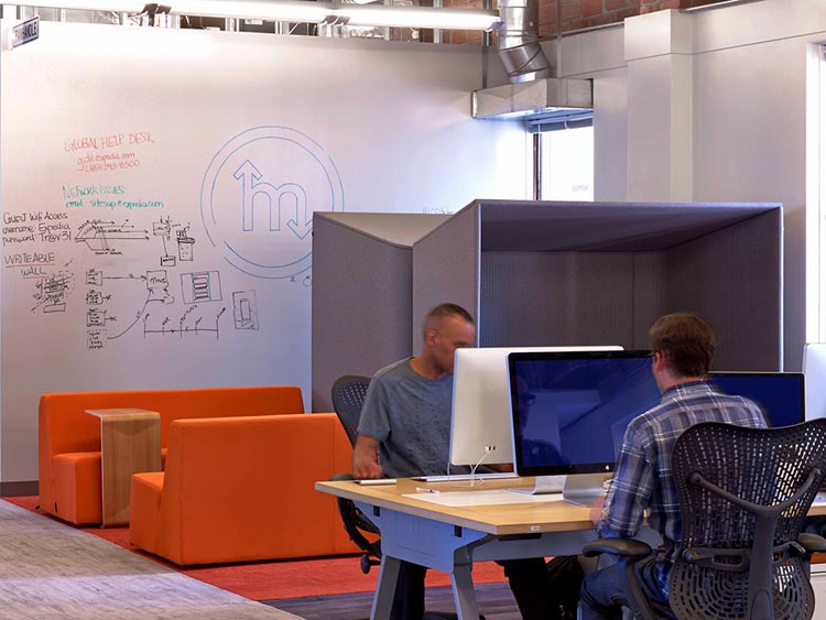 設計師根據Expedia公司的性質通過不同地區的旅行主題劃分空間,並以這些地方的名字命名空間。在設計中Rapt Studio團隊也充分調動了Expedia公司員工的參與和互動,並在利用他們搜集的一些紀念品作為辦公室的裝飾飾品,將個人的參與及互動充分注入到公司的品牌文化中。Expedia公司想要的是一個能更好的適應移動辦公和辦事處的廣泛工作環境,其中靈活性是關鍵。設計師安排了大氛圍的開敞式空間,包括大型的會議室、活動休息區,細致精巧的家具與粗獷的LOFT風格天花形成強烈的對比。全新設計的辦公室將環境和功能結合,使二者融為一體,員工在空間中能輕易找到屬於自己的私人角落,同時也有大家可以一起交流、談笑的活躍區。