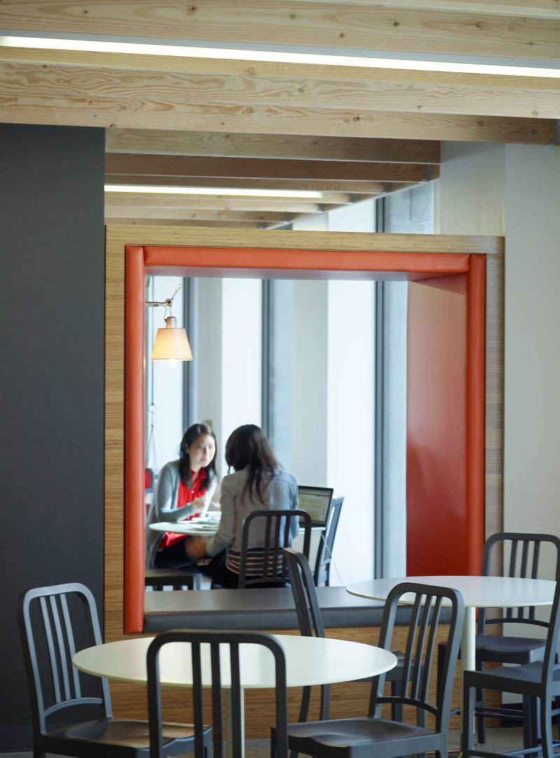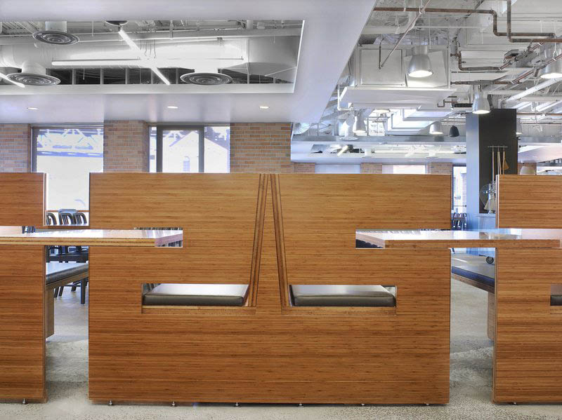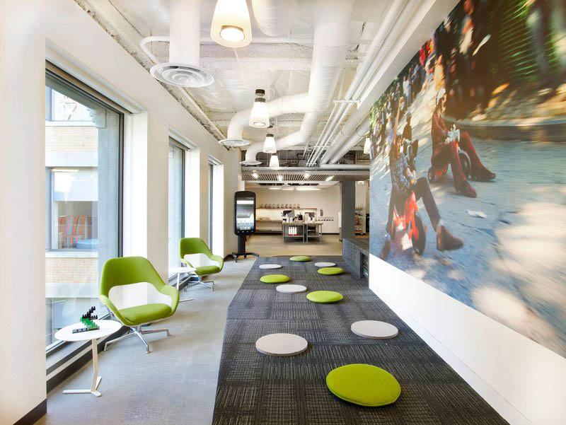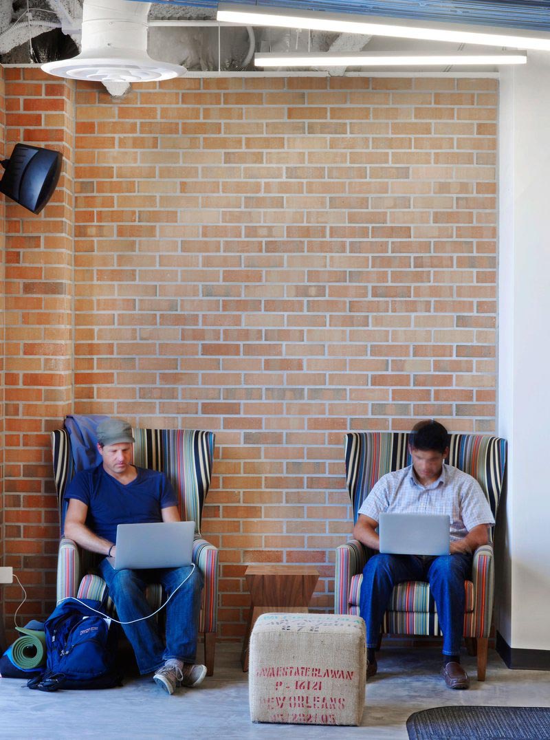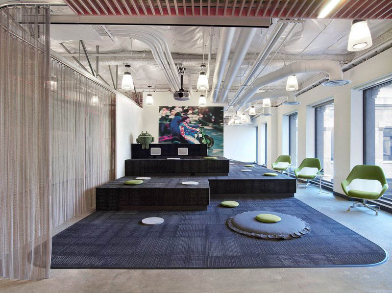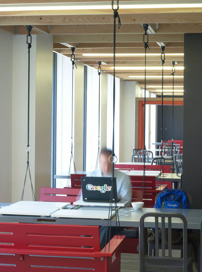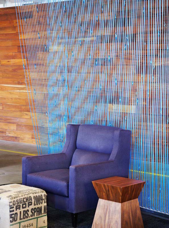 穀歌舊金山LOFT風格辦公室同我們以往看到的穀歌辦公室一樣,簡潔、有趣、自由、舒適且充滿活力,這也是穀歌的辦公空間給我們留下的深刻印象。在這個空間中雖然沒有看到穀歌標誌性的滑梯,但是,同樣可以看到其他十分有趣的設計,如紅色吊椅的辦公區、猶如大藥片似的坐墊、用藍色廢舊電線製作的簾式隔斷等。很喜歡那個打了結的藍色電線隔斷,充滿趣味。